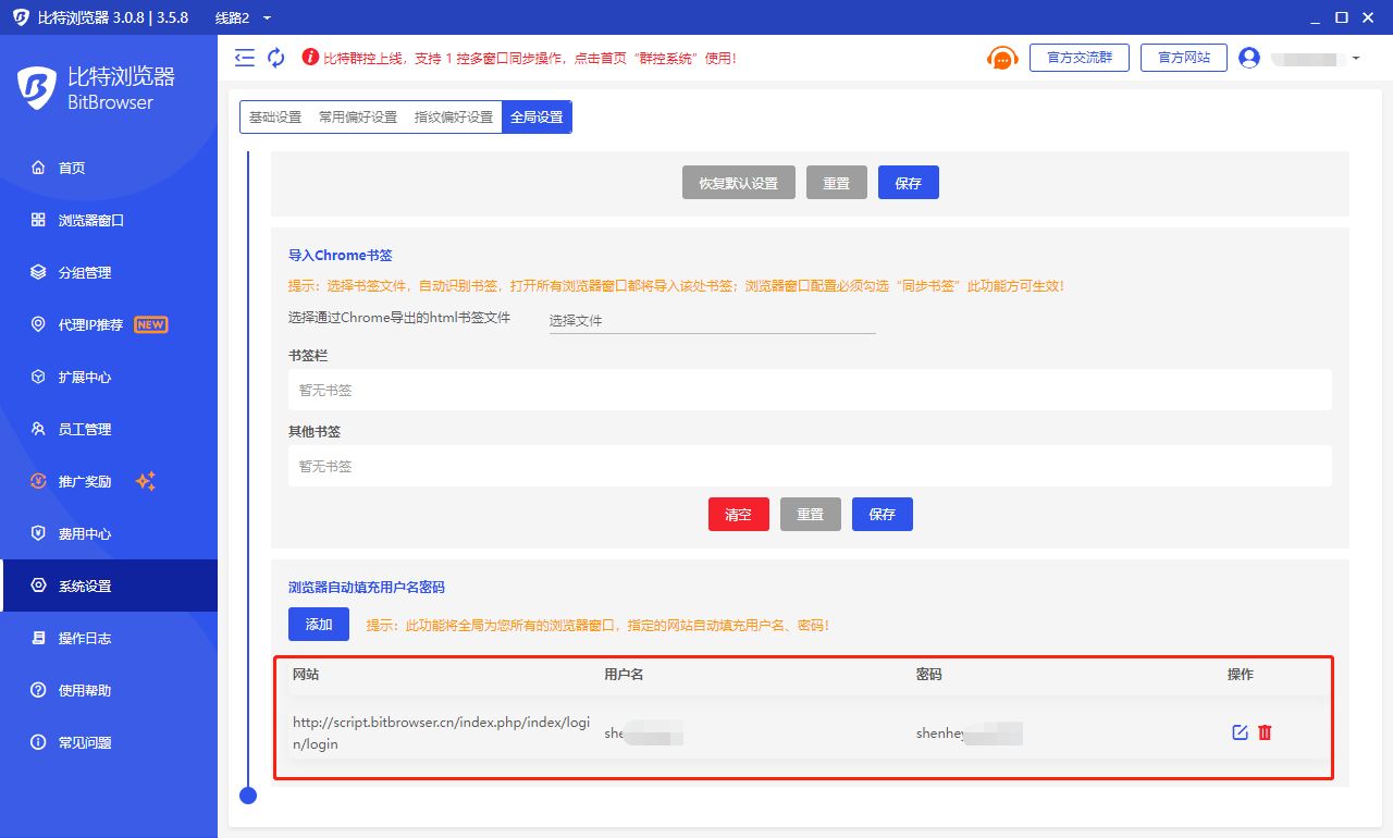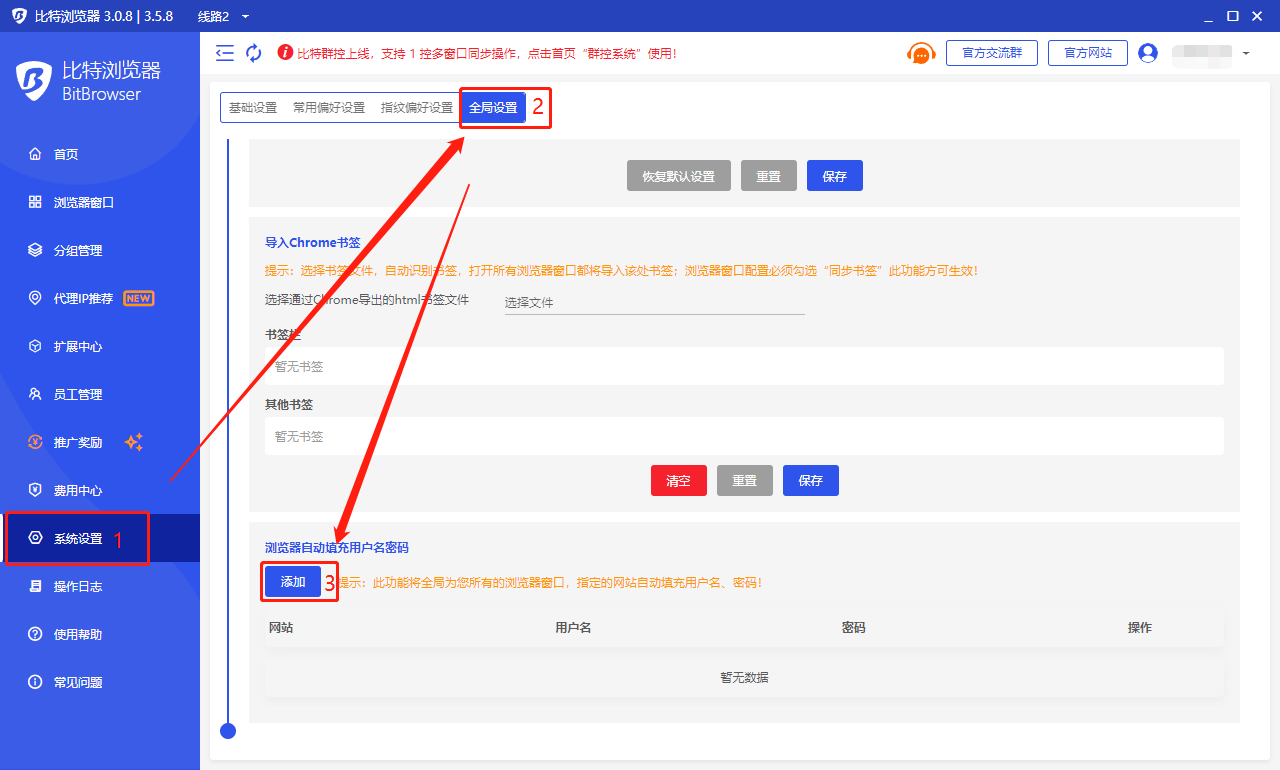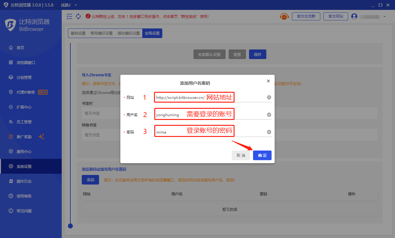 1.首先,打开“系统设置”,然后下拉到全局设置“浏览器自动填充用户名密码”,点击“添加”按钮。