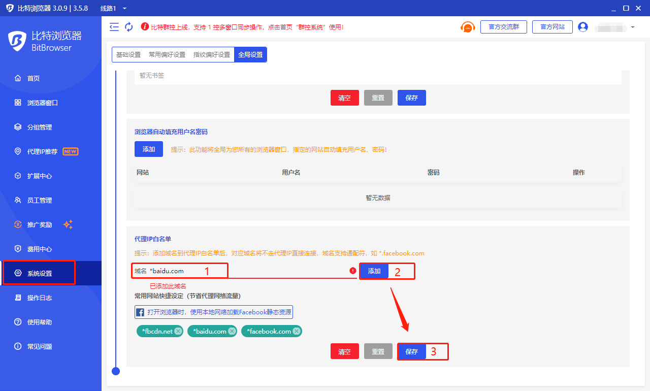 2.然后输入需要添加白名单的域名,如“*baidu.com”,点击“添加”按钮,下面显示已添加的域名地址,点击“保存”按钮。